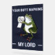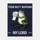 Cute bathroom design "Your Butt Napkins My Lord" design depicts a watercolor illustration of a frog offering a roll of toilet paper. This dark blue, green and white washroom design makes a nice gift for anyone who likes frogs and funny toilet posters.