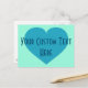 This postcard features a shapely turquoise heart on a light green background overlaid by a text template. Click "Customise it!" to re-size/re-position turquoise heart image, change background colour, and personalise text. Choose font, style, size, and colour. The reverse side of the card is blank, awaiting your personalised text or handwritten sentiments.