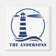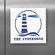 Stylish refrigerator magnet with your personalized family name or other text and a custom classic lighthouse with ocean waves in navy blue on white or choose background colors to match your decor. Makes a great unique gift.
