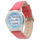 This custom watch template with semi-transparent red numbers (30% sheer) adds a nice colour accent to your background image or photo. The drop shadows give the numbers in this flat printed timepiece an embossed, almost 3D look. This design goes especially well with patriotic-themed backgrounds. When paired with a matching red band as shown here, it makes a cool watch for kids and teens.