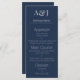 This elegant and modern wedding menu features a navy blue background. Two sample initials are printed in the top portion in a pale grey font. You can personalise to menu to include your own initials and custom food options. The bottom portion of the menu features three courses with two options each. You can replace the menu items with the food options of your choice. The back of the menu is a matching navy blue colour. It's suitable for breakfast, brunch, lunch, or dinner events.