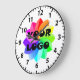 If your logo is not sized properly go into "personalise this" then "edit using design tool" then click on the logo and hold down the shift key while you resize it. Please feel free to contact me and I'll do my best to help you. This clock is a perfect addition to your office or store featuring your logo!