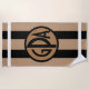 Three letter monogram set on a tan circle, with black circular border, over Wide Cabana Stripes beach or club towel.