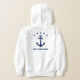 Boys hoodie with a custom classic ship's anchor, 5 stars and your personalised name, boat name or other desired text in navy blue on white. Choose from multiple colours and make adjustments to match your boat gear. Makes a great gift for any occasion.