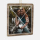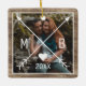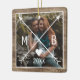 Unique, classic, trendy, rustic and decorative Christmas holiday tree ornament, with Happy Holidays and a Joyful New year text quote, and room to customize or personalize with a photo and names (or family name) of your choice on a rustic country cottage style weathered farmhouse barn wood planks texture pattern.