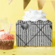This graphic design is a simple stripes pattern with black and white stripes, balloons, confetti, and a square picture frame for your photo and name.