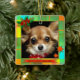 A Christmas ornament featuring a cute image of a chihuahua or your own custom photo, framed by a colorful plaid design with a Christmas theme.