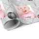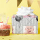 This graphic design is a simple stripes pattern with silver grey and white stripes, balloons, confetti, and a square picture frame for your photo and name.