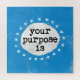 Bold text reading "your purpose is" is centred against a blue background. The black text sits on a white circle with white stars around it, providing a playful contrast against the colourful backdrop.