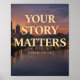 Bold Christian typography “Your Story Matters” with Psalm 139:16 over a realistic city skyline at dusk. A modern inspirational design perfect for stickers, hoodies, t-shirts, and framed wall art.