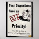 Great quality, restored Your Suggestions Have An A-1-A Priority world war 2 poster. WW2Poster store has this and hundreds of ww2 posters, mugs, ww2 stamps and more memorabilia. Relive and cherish the American history. This and many other products with Your Suggestions Have An A-1-A Priority in our collection.
