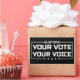 The image shows the lettering "YOUR VOTE YOUR VOICE" in clear, modern typography. The message emphasizes the importance of elections and political participation.