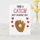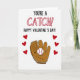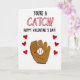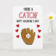 This sports Valentine's Day card features a white background with a brown baseball glove sitting in the lower half of the design. Tucked inside the glove is a white baseball with red stitches, like it was just caught and held close. Small red hearts float upward around the glove and ball, adding a sweet, romantic touch. Near the top, the card says “YOU’RE A CATCH!” in a casual handwritten style, with “YOU’RE A” in black and “CATCH!” in red. Under that, it reads “HAPPY VALENTINE’S DAY!” in black, in the same easy-to-read lettering. The whole scene feels friendly and affectionate, mixing a sports moment with a simple love message ❤️