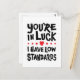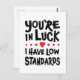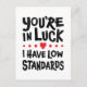 A cunning pick-up line or a gently insulting put down - it's up to you! You're in luck I have low standards is a sarcastic dating quote that can have a whole range of different meanings.