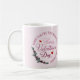 This sweet Happy Valentine's Day mug says "Baby you're the reason I always smile in a circular template. Inside says Happy Valentine's Day in an elegant script and has two red hearts. It's decorated with a spray of greenery and pink flowers. The design is on both sides. This would make a cute Valentine's gift filled with some chocolates or candy hearts!