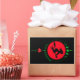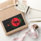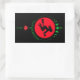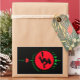 Red and green Yule design with moons, witch on a broom decorated with twinkle lights and a present.
