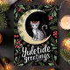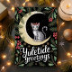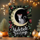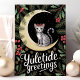 Wish someone a purrfect holiday with this enchanting Yuletide card featuring a cute cat sitting on a crescent moon. Surrounded by festive holly and pine branches against a starry night sky, this whimsical card brings holiday cheer with an extra touch of feline charm. Perfect for cat lovers and anyone who enjoys a touch of magic during the festive season.