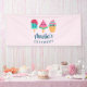 Business banner with an illustration of 3 different ice cream treats. A blue-green popsicle with strawberry drippings and colourful sprinkles. A watermelon popsicle. A cone with layers of delicious ice cream in pink and mint. All with cute kawaii smiles.