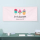 Business banner with an illustration of 3 different ice cream treats. A blue-green popsicle with strawberry drippings and colourful sprinkles. A watermelon popsicle. A cone with layers of delicious ice cream in pink and mint. All with cute kawaii smiles.