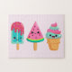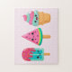 A puzzle with an illustration of 3 different ice cream treats. A blue-green popsicle with strawberry drippings and colourful sprinkles. A watermelon popsicle. A cone with layers of delicious ice cream in pink and mint. All with cute kawaii smiles.