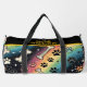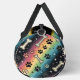 This colourful pattern duffle bag boasts a zany rainbow gradient background featuring various coloured paw prints and playful bones with star accents. It's a cute design pet accessory and versatile travel gear, perfect for any pet lover.