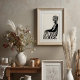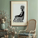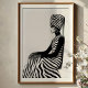 Make a striking statement with this captivating black and white art print, a masterful display of avant-garde fashion and bold graphic design. This elegant portrait features a woman draped in an iconic zebra-striped ensemble, creating a mesmerising visual rhythm. Her tall, sculptural headpiece, a dramatic extension of the striped pattern, frames her serene profile and expertly made-up face. Dressed in a sleek, long-sleeved turtleneck top and a flowing skirt, the monochrome stripes are used with daring precision to accentuate her form and create a powerful, immersive pattern. Leaning gracefully against a crisp white and subtly shadowed wall, the composition emphasizes the stark contrast and the dynamic interplay of lines. Perfect for modern living spaces, fashion studios, or any decor seeking a touch of unique elegance, minimalist flair, and an unforgettable graphic presence.