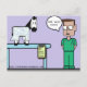 A sick zebra is sitting in a hospital room. A doctor says, "get well soon". The zebra is wearing a hospital gown. This object is a postcard. http://zebrahumor.wordpress.com