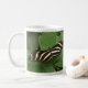 This stunning mug features a photograph of a beautiful tropical butterfly. This species is called a Zebra Longwing Butterfly (Heliconius charithonia) and is covered in vivid black and white stripes across each wing. It comes from America. The photograph was taken using macro photography for a stunningly detailed result.