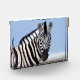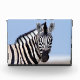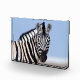 Portrait of a zebra against blue sky. The image was taken in Namibia, Etosha National Park.