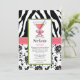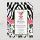 These cute and trendy zebra print and damask bachelorette party invitations with a pink ribbon design, green bead border and a pink martini and an olive on top mix formality with fun! Artwork © Chrissy H. Studios, LLC. All Rights Reserved.