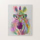 This watercolor print features a colourful portrait of a zebra in orange glasses adorned in flowers | By Fab Funky. Image ID: 192221D