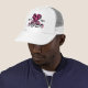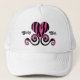 A cute zebra print heart in black and hot pink with elegant swirls on a white mesh hat.