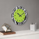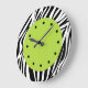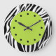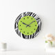 Zebra animal wall clocks with black and white zebra stripes pattern on the clock face and green background in this wall decor animal clock design for your kitchen, bathroom, or any room in your house you want to add some colour and character. Great for African decor or wildlife lovers.