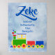 Zeke Name Poster on blue watercolor background, with a colourful train and customisable text. The adjectives start with each letter of the chosen name. You can customise the adjectives for this name or choose another name and corresponding adjectives. Or you can contact me to customise a poster with your name of choice. NOTE: when customising, the top name is written twice (once in blue and once with a lighter "shadow") to make it stand out.