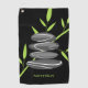 Zen golf towel with stacked pebble stones design. Zen design with green bamboo leaves.