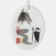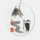 A Zen pilgrim crosses a great distance, approaching a snow capped mountain. It's a metaphor for achieving enlightenment, of course! The original painting was done with Chinese brush painting techniques on white rice paper, and it is rendered nicely on these porcelain ornaments.