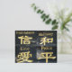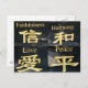 Zen design features words and Chinese symbols for faithfulness, harmony, love and peace.