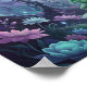 This fantasy poster features a meditating frog on a lily pad amid glowing lotus blooms and swirling aurora in an enchanted starry forest.