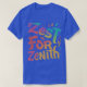 A vibrant T-shirt design featuring the text "Zest for Zenith" in a playful, multi-coloured font, reminiscent of a sunset. The design is bold and eye-catching, with the colours transitioning smoothly from orange to yellow to pink. The text is centred on the chest of the shirt, with a small, colourful graphic of a sunburst below it. The design is perfect for anyone who loves to live life to the fullest