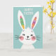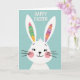 This card shows a friendly, human-like bunny centered on a muted teal background, looking straight out with an inviting, affectionate expression 🐰. Its tall white ears rise upward, and inside each ear sit egg-shaped patterns in pastel green, yellow, orange, and purple with zigzags and stripes that feel like little gifts tucked close. The bunny’s large black eyes with small lashes and its gentle smile suggest the kind of warm attention you’d give a close friend. Soft pink cheeks and thin black whiskers add a tender, bashful touch, as if it’s quietly pleased to be near someone. Across the top, a seasonal greeting appears in bold white sans-serif letters, spaced clearly above the bunny’s head. The teal backdrop has a faint grainy texture that keeps the flat shapes from feeling stark, and the overall palette stays soft and springlike 🌷. The patterned eggs sit neatly within the inner ear shapes, framed by crisp white edges against the teal field.