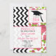 A class of 2014 graduation announcement featuring a background of hot pink roses and black zigzags on front and back. Front features "Class of 2014" text with graduation cap design. Personalise with details of your occasion.