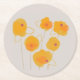 This paper coaster features a floral illustration consisting of a bouquet of orange zinnias in the centre, on a light grey background.