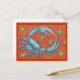 Cancer, the crab, walks on a beach covered with stars. Water sign, June 22 - July 23 (there may be a variation in the dates). Postcard with an orange, blue and yellow customisable design for you to personalise with your own text, images and ideas. An original coloured pencil and metallic ink drawing by Jess Perry.