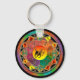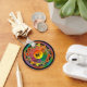 Zodiac Sign Sagittarius Mandala Keychain. An orange, green and rainbow coloured mandala with the astrological symbols for zodiac sign Sagittarius the Archer. Symbols for ruling planet Jupiter, the element of fire and the Caduceus symbol of the healer