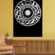 This intricate black and white design showcases a full zodiac wheel encircling a radiant sun face at the centre. Each zodiac sign is represented with bold, symbolic illustrations arranged in a perfect circular pattern. The high-contrast style gives it a timeless, mystical feel, making it ideal for astrology enthusiasts drawn to cosmic balance, celestial cycles, and symbolic meaning.