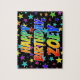 This fun, exciting, birthday-themed jigsaw puzzle design has the message "HAPPY BIRTHDAY, ZOEY" with the characters having a colourful rainbow spectrum inspired gradient pattern, along with a lively field of stars background pattern. An exciting puzzle like this might be used to send birthday greetings to somebody named Zoey. [~Z0000468]