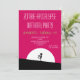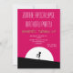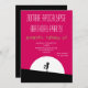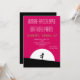 A zombie apocalypse birthday party invite. Pink and black bold vibrant colour scheme. A cool zombie silhouette with arms outstretched on the hunt for brains. A big white moon illuminates from behind.