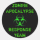 small round sticker with bio hazard symbol in the middle of some bright green text