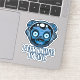 Vector cartoon illustration of a zombie astronaut with big eyes wearing a space helmet with a cracked glass shield in shades of blue with Everything Is Fine text. Tags: astronaut, cosmonaut, helmet, zombie, space, spaceman, monster, cadet, corpse, dead