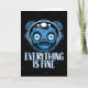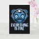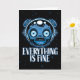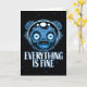 Vector cartoon illustration of a zombie astronaut with big eyes wearing a space helmet with a cracked glass shield in shades of blue with Everything Is Fine text. Tags: astronaut, cosmonaut, helmet, zombie, space, spaceman, monster, cadet, corpse, dead